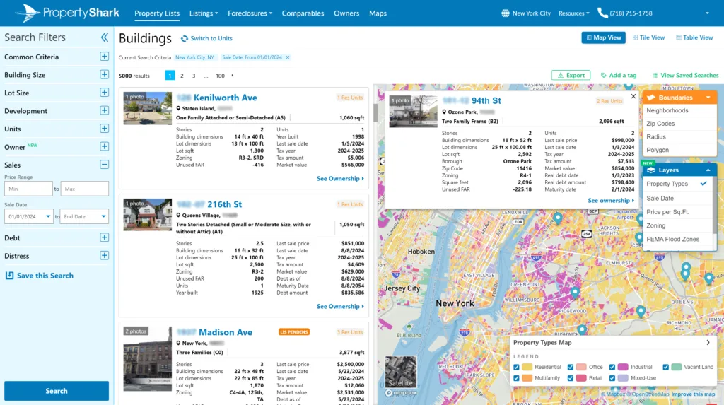 PropertyShark covers all sectors of commercial real estate, including multifamily, retail, office, industrial, and land. It also covers residential property types such as single-family homes, co-ops, condos, and townhomes. The team is actively working to expand geographic coverage across all 50 states.